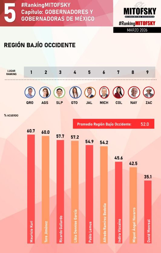 • El mandatario potosino alcanza el sexto lugar nacional en el ranking de aprobación ciudadana de Consulta Mitofsky durante el mes de marzo.