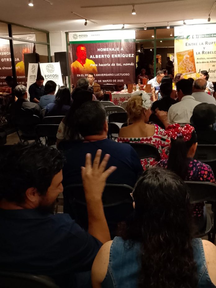 En un recinto que congregó a amigos y admiradores de Alberto Enriquez, Valdespino con el acompañamiento de Gabriel Barragán, Patricia Lobaton, Marina Gutiérrez, Ignacio Martínez Maya y el licenciado Juan Luis Flores Almazán, director del Centro Cultural de la Huasteca Potosina que auspició la noche de letras en el Museo Tamuantzan el 21 de Marzo, entre otras personas.