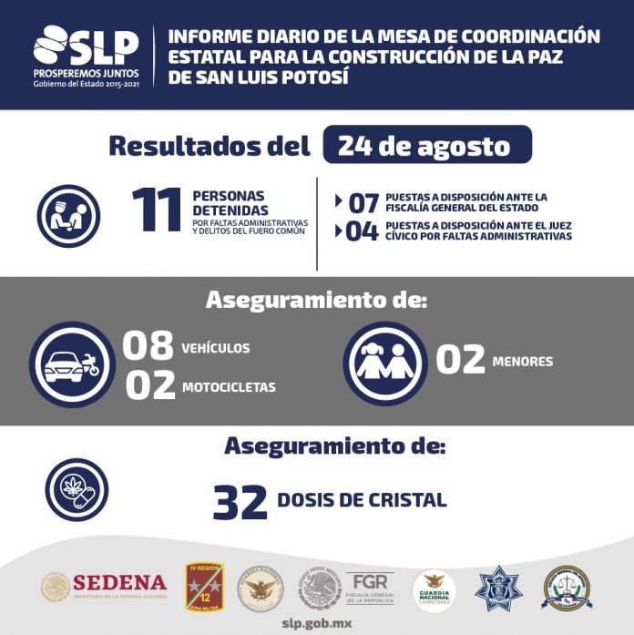 La Dirección General de Seguridad Pública del Estado (DGSPE), en coordinación con autoridades federales y municipales, mantienen un operativo permanente para prevenir y evitar saqueos o hechos de vandalismo durante la contingencia sanitaria; al corte del 24 de agosto no se reportan incidentes.
