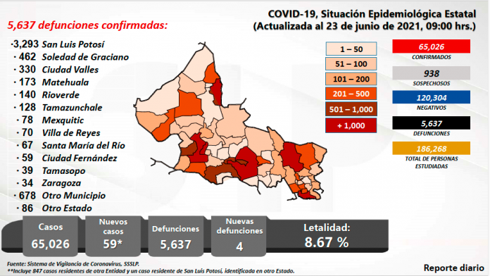 Por su parte, Fernando Hernández Maldonado, director de Salud Pública, dijo que este día se presentaron 59 nuevos casos para llegar a 65 mil 026 confirmados de 186 mil 268 personas estudiadas; se han descartado 120 mil 304 personas y la cifra de pendientes de estudio es de 938 sospechosos. Los decesos subieron a 5 mil 637 con un índice de letalidad que se ha mantenido de 8.67 decesos por cada 100 casos.