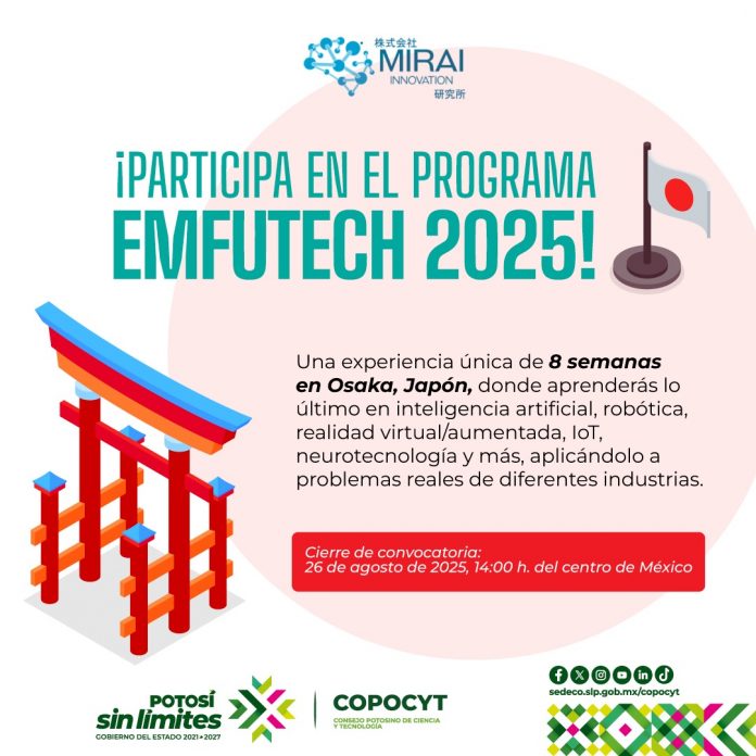 El Consejo Potosino de Ciencia y Tecnología (Copocyt) convoca a estudiantes de posgrado de programas presenciales a participar en el Programa de Formación en Tecnologías Emergentes del Futuro, EmFuTech 2025, que se llevará a cabo en Osaka, Japón del 29 de septiembre al 21 de noviembre de 2025. Este programa intensivo de ocho semanas combina capacitación técnica, proyectos aplicados, mentorías especializadas y participación en la Expo Mundial Osaka 2025.