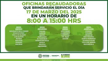 Para facilitar a las y los potosinos la realización de trámites, la Secretaría de Finanzas (Sefin), brindará atención en 30 oficinas recaudadoras distribuidas en las cuatro regiones del Estado el próximo lunes 17 de marzo, a pesar de ser un día de asueto oficial.