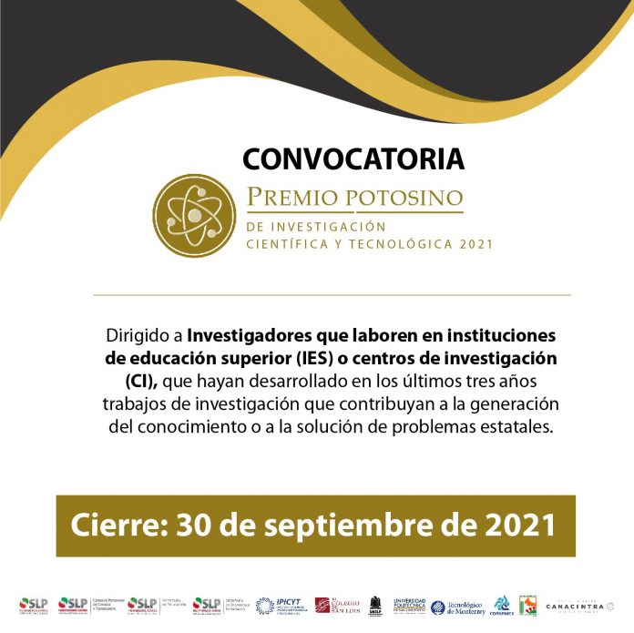 El Premio Potosino de Investigación Científica y Tecnológica 2021, está dirigido a las y los investigadores que laboren en instituciones de educación superior (IES) o centros de investigación (CI), que hayan desarrollado en los últimos tres años trabajos que contribuyan a la generación del conocimiento o a la solución de problemas estatales en las áreas de Ciencias exactas y naturales, Ciencias de la ingeniería, Ciencias médicas y de la salud y Ciencias sociales y humanidades. Cada área cuenta con las categorías de Investigador joven y consolidado.