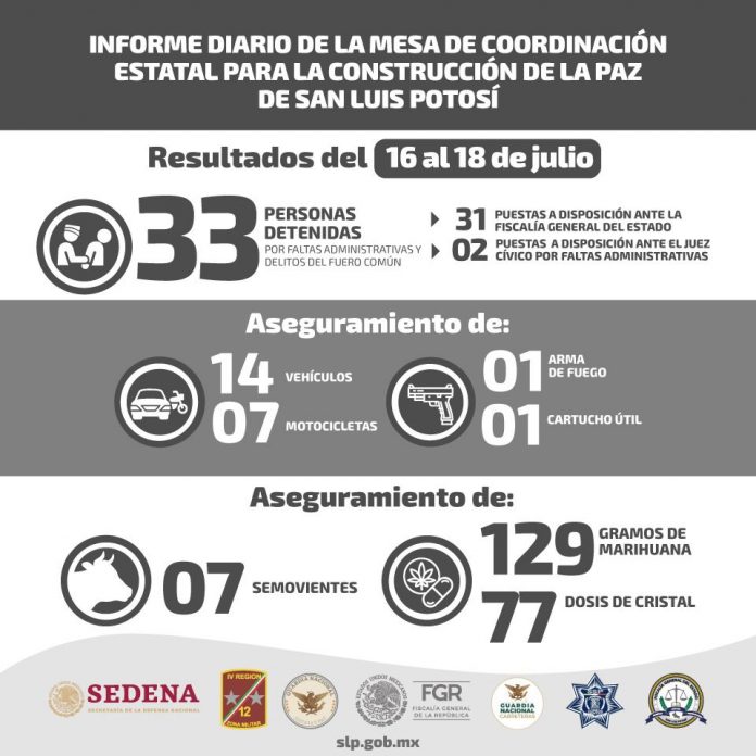 Como resultado de las actividades y diversos operativos realizados durante el pasado fin de semana, la Mesa Estatal para la Construcción de la Paz, informó que fueron detenidos 33 individuos que se encuentran a disposición de las autoridades correspondientes.