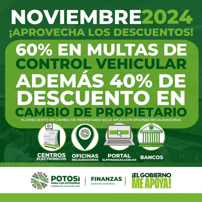 Durante noviembre, el Gobierno del Estado a través de la Secretaría de Finanzas (Sefin), brindará más apoyo a las y los potosinos, mediante un programa de descuentos, de 60 por ciento en multas de control vehicular y 40 por ciento en cambio de propietario con el objetivo de que más personas accedan a los programas gratuitos.