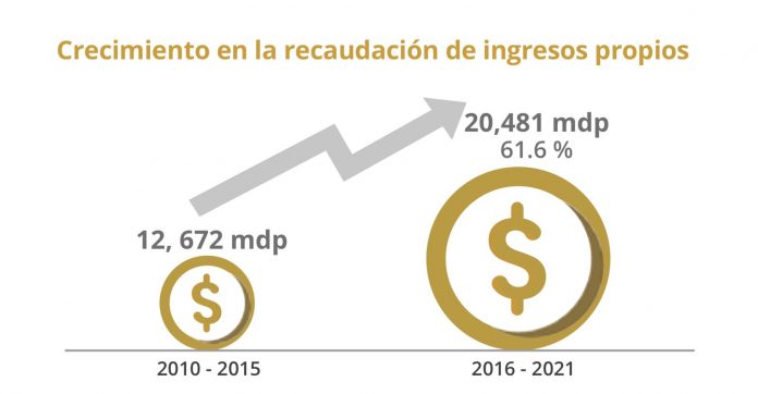 Pedroza Gaitán subrayó que, como resultado de las estrategias implementadas en la política de ingresos, en el periodo 2016 – 2021 se recaudará un monto acumulado de 20 mil 481 mdp, lo que representa un incremento del 61.6 por ciento respecto al mismo periodo de la anterior administración.