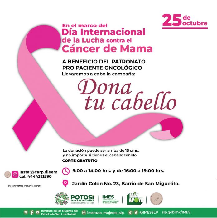 En el marco del Día Internacional de la Lucha Contra el Cáncer de Mama, que es considerada la principal causa de muerte por tumor maligno en mujeres mexicanas, el Instituto de las Mujeres del Estado (Imes), en coordinación con la fundación “Carpe Diem” invita a las potosinas a que este viernes 25 de octubre acudan a sus instalaciones en Jardín Colón número 23, en el Barrio de San Miguelito, para ser parte de la campaña “Dona Tu Cabello”.