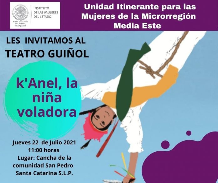 El Instituto de las Mujeres del Estado (IMES) invita a la presentación del cuento K´Anel “La niña voladora” que se realizará a través de una obra en Teatro Guiñol este jueves 22 de julio a las 11:00 horas, en la Cancha de la comunidad de San Pedro del municipio de Santa Catarina.