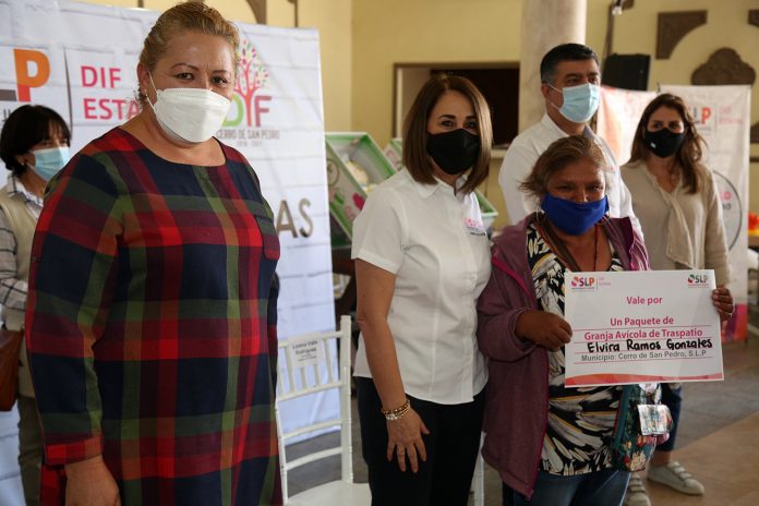 En visita de trabajo a Cerro de San Pedro, la Presidenta de la Junta Directiva del Sistema Estatal para el Desarrollo Integral de la Familia (DIF), Lorena Valle Rodríguez, entregó paquetes de granjas avícolas, paquetes para bebé, apoyos alimentarios y bicicletas.