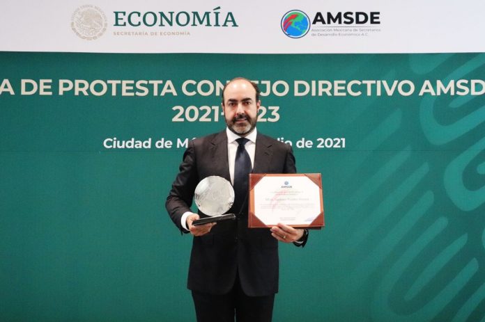 En el marco de la toma de protesta del Consejo Directivo de la Asociación Mexicana de Secretarios de Desarrollo Económico (AMSDE) 2021-2023, encabezada por la Secretaria de Economía, Tatiana Clouthier, se entregó un reconocimiento a Gustavo Puente Orozco, secretario de Desarrollo Económico de San Luis Potosí, por su labor al frente de este organismo durante el periodo 2019-2021.