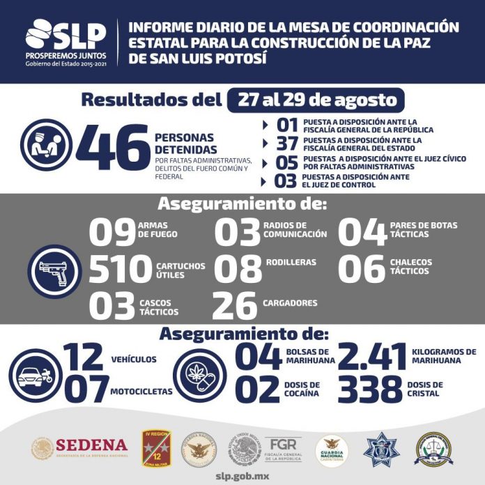 Las corporaciones de seguridad en la entidad que integran la Mesa Estatal para la Construcción de la Paz, detalló que tras los operativos llevados a cabo el pasado fin de semana, se consolidó la detención de 46 personas por delitos y faltas administrativas.