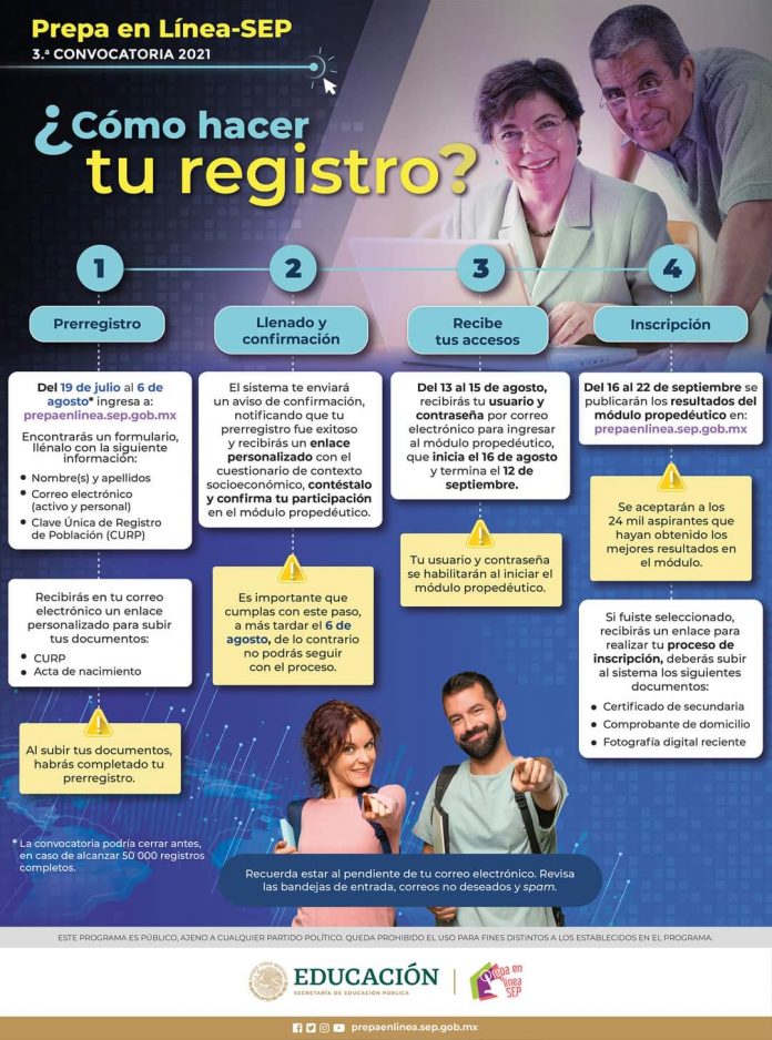 Mencionó que las y los interesados deberán registrar su nombre completo; Clave Única de Registro de Población (CURP) y dos correos electrónicos personales (principal y alterno), en el sitio prepaenlinea.sep.gob.mx; en el que la fecha límite para inscribirse es el viernes 6 de agosto, “el plan de estudios consta de 23 módulos, que se cursan uno por mes, y cumple con los propósitos de la Nueva Escuela Mexicana, ya que los recursos educativos digitales y las estrategias didácticas implementadas contribuyen a que los estudiantes empleen la tecnología para desarrollar habilidades, conocimientos y aptitudes”.