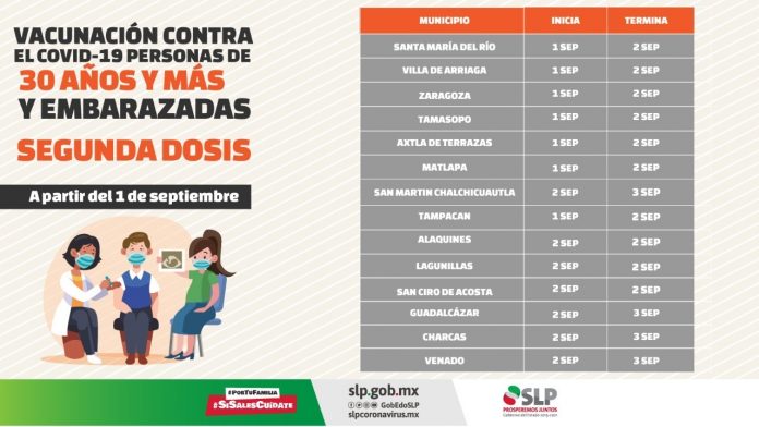 A partir del 3 de agosto, podrán acudir las y los ciudadanos de Armadillo de los Infante, Cerro de San Pedro, San Nicolás Tolentino, Villa Juárez, Tancanhuitz, Tanlajás, Coxcatlán y Huehuetlán; el día 4 estará vigente solo en Santa Catarina; Tampamolón y San Antonio tendrán su fecha el día 5 de septiembre y finalmente, el día 6 podrán inmunizarse en Ciudad del Maíz.