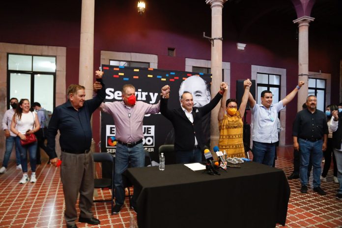Estuvo acompañado de los presidentes de los partidos del PRI, PAN, PRD y Conciencia Popular, Elías Pesina, Juan Francisco Aguilar, Cristina Gaytán y Oscar Vera, respectivamente.