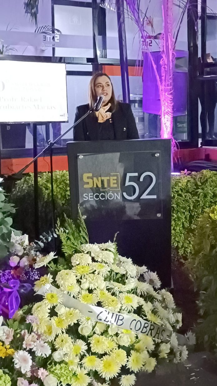 En su mensaje, la Mtra. Guerrero Milán evocó la figura del Profesor Turrubiartes como un referente de integridad y compromiso, subrayando que su ejemplo continúa inspirando a la Sección 52 en tiempos de nuevos desafíos. “Fue un hombre de visión, coraje, determinación, humanismo, espíritu de servicio y profunda humildad”, expresó. “Nos enseñó que la verdadera fortaleza del sindicalismo está en la convicción, no en la imposición; en la razón, no en el sometimiento; en la unidad, no en la división.”