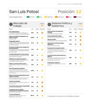 El Estado de San Luis Potosí logró un avance significativo en el Índice de Competitividad Estatal 2025 al subir seis posiciones respecto del año pasado y ubicarse en el lugar 12, además está en un nivel de media alta de acuerdo con el reporte del Instituto Mexicano de Competitividad (IMCO).