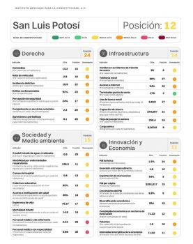 El Estado presenta mejoras notables en disminución de homicidios en la posición 16, con un porcentaje de 13.2 por cada cien mil habitantes; en otros delitos como robo de vehículos está en la posición 18; en percepción de seguridad en el lugar 17; en infraestructura ocupa el lugar 14 a nivel nacional; destaca en carga aérea en la posición 9; en telefonía celular, acceso a internet está en media baja, pero en terminales punto de venta está en tercer lugar con una competitividad alta.