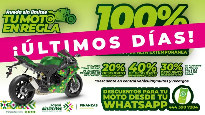 Como parte de las políticas de apoyo del Gobernador Ricardo Gallardo Cardona, la Secretaría de Finanzas (Sefin) mantiene vigente hasta el 10 de diciembre el programa «Tu moto en regla, rueda sin límites», una estrategia que facilita la regularización de motocicletas con beneficios directos para las y los propietarios, accediendo a descuentos del 40, 30 y 20 por ciento en adeudos totales, dependiendo del rezago, además de un apoyo del 100 por ciento en multas, recargos y actualizaciones para unidades nuevas que aún no cuentan con registro.