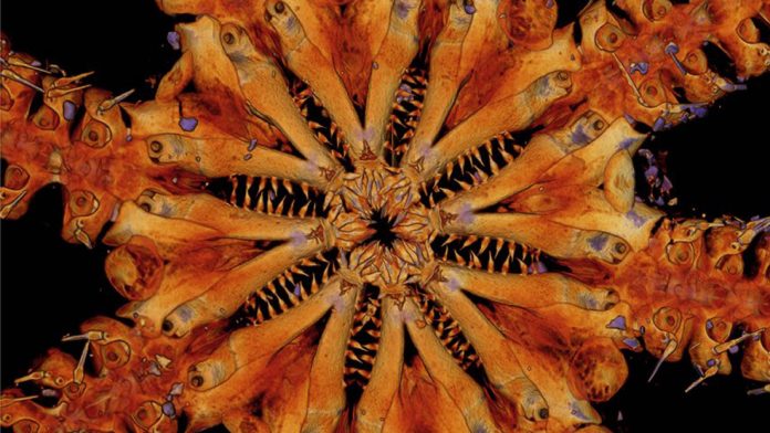 Ophiojura, única en su género, cuenta con ocho largos brazos armados con una serie de anzuelos y espinas. El experto explicó que una microtomografía computarizada reveló hileras de dientes afilados en todas las mandíbulas, que supuestamente sirven para atrapar y destrozar a sus presas.