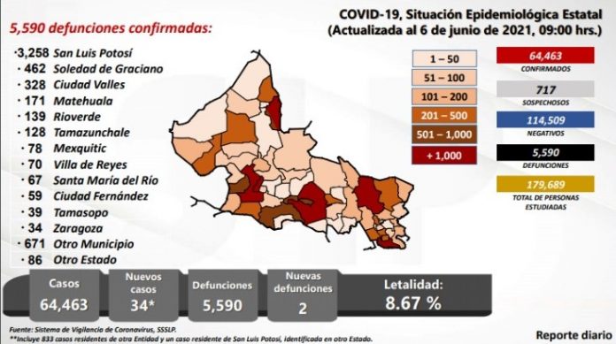 La Secretaría de Salud de Gobierno del Estado informó que en San Luis Potosí se llegaron a los 64 mil 463 casos confirmados por Covid 19 desde la presencia del primer caso, después de que se sumaron 34 nuevos casos en 24 horas, además de las víctimas fatales que suman dos más.
