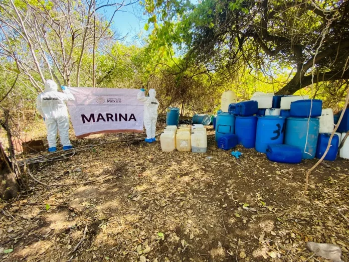 Personal naval, en coordinación con elementos de la Fiscalía General de la República (FGR), aseguró en el predio mil 500 litros de precursores químicos.