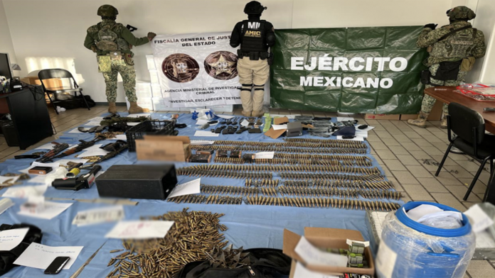En Mazatlán, se aseguraron tres armas largas, un aditamento lanzagranadas, 72 cargadores, mil 752 cartuchos, dos granadas para mortero, cuatro grandas, 7 mil 394 eslabones metálicos, dos cañones con cajón de mecanismo, 14 chalecos tácticos y cuatro placas balísticas.