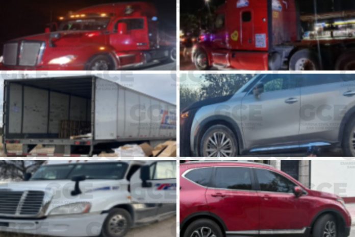 San Luis Potosí, S.L.P.- La estrategia preventiva que sin límites desarrollan en los 59 Municipios tanto la Guardia Civil Estatal como su División Caminos, permitieron que durante las últimas 24 horas fueran recuperadas dos camionetas, así como tres tractocamiones y una caja seca las cuales contaban con reporte de robo.