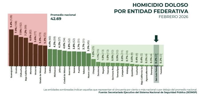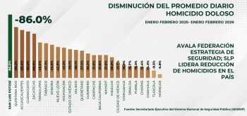 Lo anterior lo informó el titular de la Secretaría de Seguridad y Protección Ciudadana del Estado (SSPC), Jesús Juárez Hernández, quien recordó que este martes, durante la conferencia mañanera de la Presidenta, se destacó la disminución del 86 por ciento en el promedio diario de homicidios dolosos durante el primer bimestre de 2026, situándose en el primer lugar nacional por reducción en este rubro.