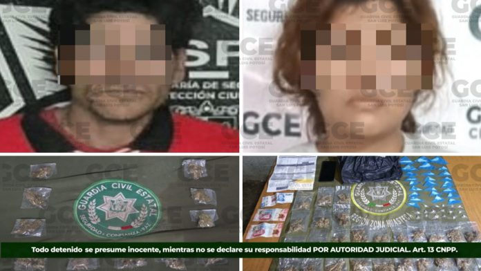 Asimismo, en la colonia República, en Matehuala, la GCE aseguró a José “N”, de 39 años y en Ciudad Valles, detuvo a Karla “N”, de 24 años, a quien se le aseguraron diversas dosis de droga, una lista con información, un teléfono celular y dinero en efectivo.