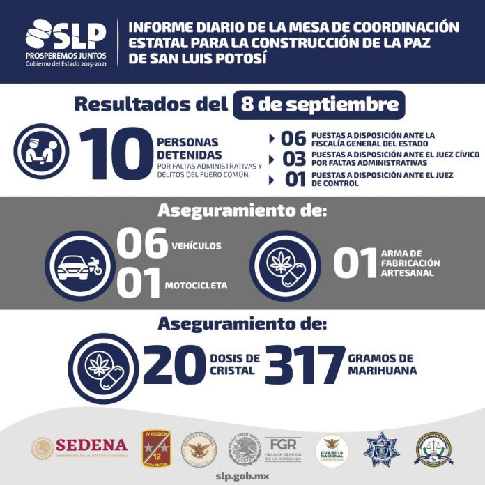 Resultado del trabajo conjunto entre las corporaciones de seguridad y procuración de justicia, este miércoles, la Mesa Estatal para la Construcción de la Paz, dio a conocer que elementos de la Fuerza Metropolitana Estatal, personal de SEDENA, Guardia Nacional y Policía Municipal en el Operativo San Luis Seguro, realizaron el aseguramiento de 25 bolsas de marihuana con un peso aproximado de 317 gramos, 19 bosas de cristal con peso aproximado de 28 gramos, así como una cachimba.