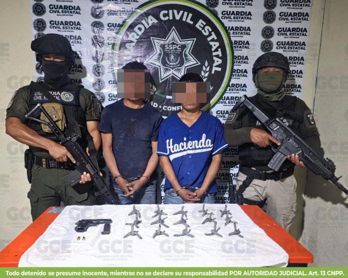 Un operativo efectuado por nuestros elementos de la Guardia Civil Estatal en el municipio de Catorce, derivó en la detención de Antonio “N” de 33 años y de Adelaido “N” de 18 años, a quienes se les aseguró en Estación Catorce, un arma de fuego calibre .380, abastecido con dos cartuchos útiles, 15 artefactos metálicos conocidos como “poncha llantas” y un automóvil Toyota color blanco, modelo 2021 con placas del estado de Guerrero.