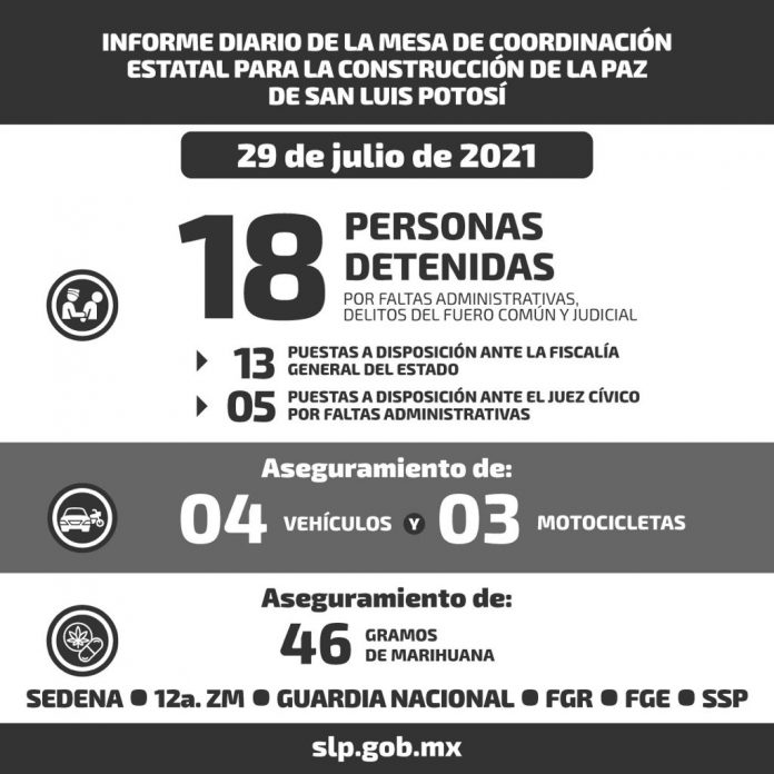 Conformada por las diversas corporaciones de seguridad y procuración de justicia en la entidad, la Mesa Estatal para la Construcción de la Paz detalló este día la detención de 18 personas; siendo 13 de ellas puestas a disposición de la Fiscalía General del Estado y 5 presentadas ante el juez cívico por faltas administrativas.