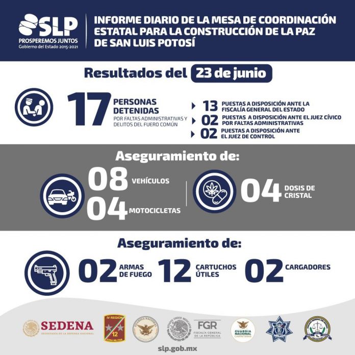 Derivado de las acciones y operativos realizados en San Luis Potosí de manera conjunta entre las corporaciones de seguridad y procuración de justicia, la Mesa Estatal para la Construcción de la Paz informa que, se llevaron a cabo diversos aseguramientos y detenciones a lo largo de las cuatro regiones de la entidad.