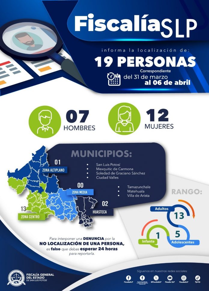 La Fiscalía General del Estado de San Luis Potosí (FGESLP) informa que, gracias a las investigaciones realizadas en la última semana que comprende del 31 de marzo al 6 de abril de 2025, se logró localizar a 19 personas que contaban con ficha de búsqueda activa.