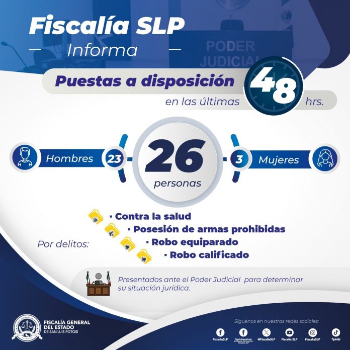En este fin de semana, la Fiscalía General del Estado de San Luis Potosí (FGESLP) llevó ante los Jueces de Control del Poder Judicial a 26 personas que fueron detenidas por presuntos delitos contra la salud, posesión de armas prohibidas, robo equiparado y robo calificado.
