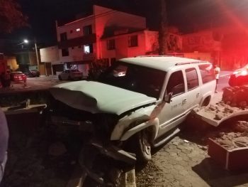 De acuerdo al reporte de la jefatura de hechos de tránsito terrestre de la SSPC, cerca de las 23:30 horas de este martes, se acudió al reporte de un choque en la avenida Prolongación Muñoz y calle del Chopo de la colonia Jacarandas, donde se encontró una vagoneta marca Chevrolet Suburban color blanco con rótulos oficiales de gobierno estatal, cuyo conductor habia impactado contra el muro de mampostería de la glorieta de Jacarandas presuntamente tras la pérdida de control del volante.