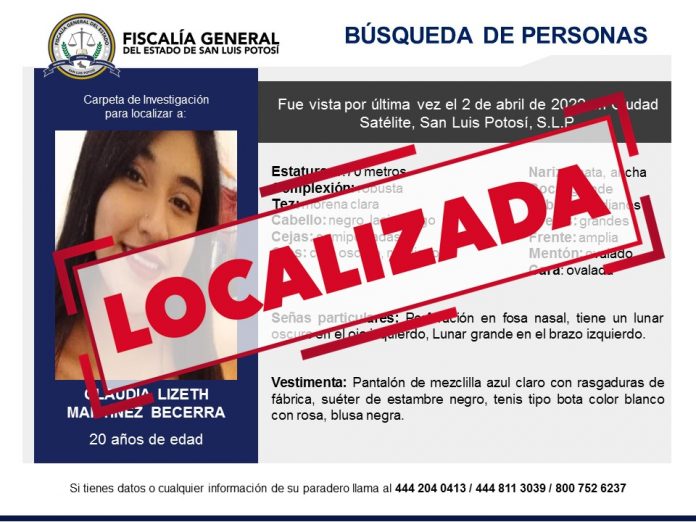 SLP. – Personal de la Fiscalía General del Estado (FGE) localizó sana y salva a una joven de 20 años de edad, sobre quien se inició una ficha de búsqueda el 4 de abril de 2022 en la ciudad Capital.
