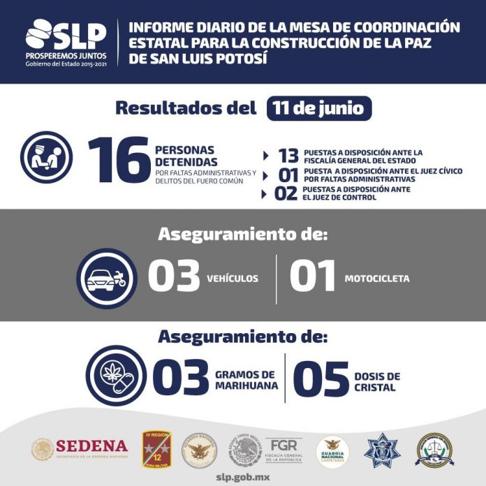 La Mesa Estatal para la Construcción de la Paz dio a conocer que, a través de diversas acciones y operativos realizados con la colaboración de las corporaciones de seguridad, se logró la detención de 16 personas.