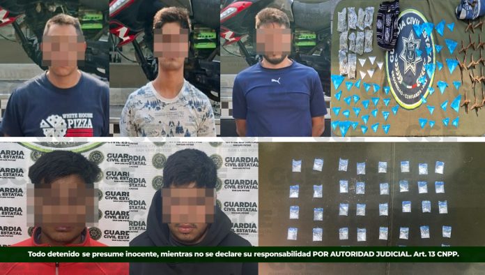 El primer hecho tuvo lugar en el municipio de Ciudad Valles, donde efectivos de la GCE detuvieron a Juan “N” de 21 años, Leonardo “N” de 26 años y a Jashiel “N” de 27 años, luego de asegurarles 48 dosis de “cristal”, 10 bolsas con marihuana, cinco de cocaína, 14 objetos “poncha llantas” y una motocicleta en la que se desplazaban.