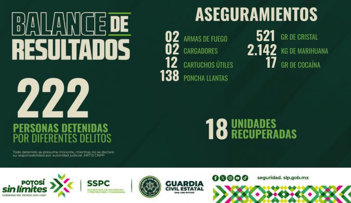 Como resultado de las acciones preventivas orientadas a inhibir conductas ilícitas, la Guardia Civil Estatal (GCE) informa que, durante el periodo del 20 al 26 de diciembre de 2025, se logró la detención de 222 personas, presuntamente involucradas en diversos hechos constitutivos de delito.