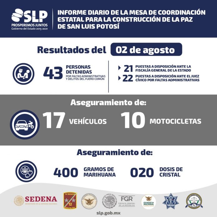 Como resultados de acciones y operativos en el territorio potosino, realizados el pasado fin de semana, al iniciar este mes de agosto, la Mesa Estatal para la Construcción de la Paz informó que 43 personas detenidas fueron puestas a disposición de las autoridades correspondientes, por diversos delitos y faltas.