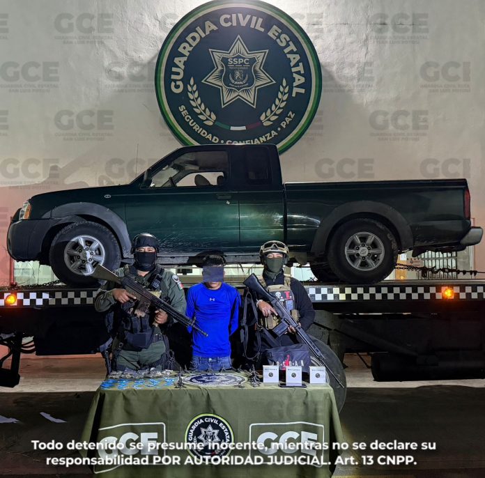 Ciudad Valles, S.L.P.- Operativos a cargo de la Guardia Civil Estatal que se han intensificado en la región Huasteca, derivaron en la detención de dos hombres presuntos integrantes de un grupo criminal, a quienes se les aseguró droga, “poncha llantas” y cámaras de videovigilancia.