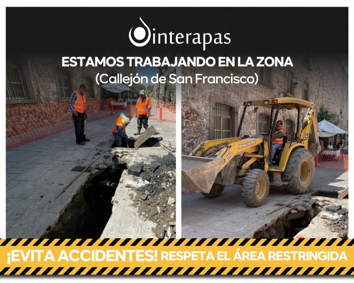 La zona peatonal permanecerá cerrada temporalmente por el uso de maquinaria y para garantizar la seguridad de los transeúntes. INTERAPAS solicita la colaboración de la población para atender las indicaciones del personal y respetar la señalética instalada en el área de trabajo.