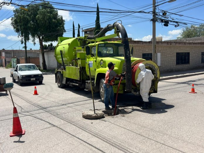Con apoyo de maquinaria tipo Vactor, personal especializado llevó a cabo la limpieza profunda de pozos de visita en la colonia Pedroza, en las calles: