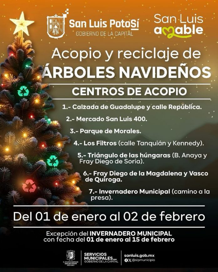 Indicó que los centros de acopio estarán operando todo el mes de enero y hasta el 2 de febrero. Las ubicaciones son: en la Calzada de Guadalupe y Calle República; en el Mercado San Luis 400; en el Parque Morales y en la parte trasera de la Planta Los Filtros, en la confluencia de las calles Tanquíán y Kennedy.