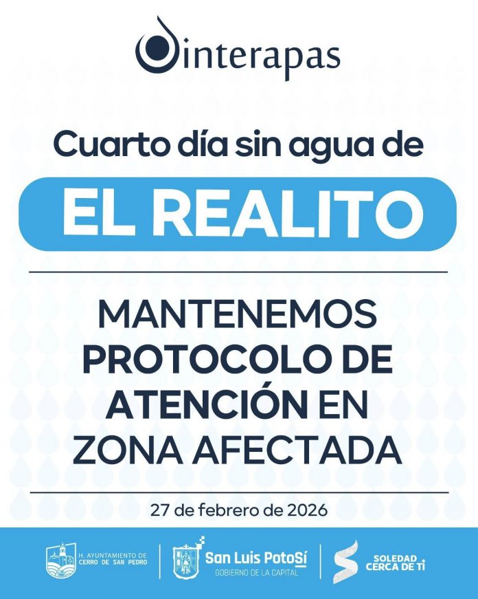 SLP.- Este viernes se cumplen cuatro días consecutivos sin que llegue agua proveniente del sistema “El Realito”. Ante esta situación, INTERAPAS continúa con su protocolo de atención en las zonas afectadas.