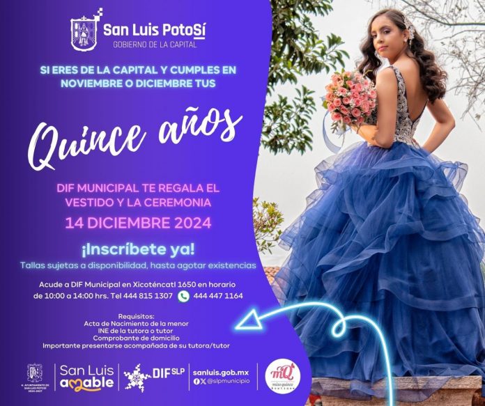 SLP.- Si vives en la Capital potosina, cumples 15 años en noviembre o diciembre y aún no tienes vestido: ¡esta es tu oportunidad! El DIF Municipal te lo regala y realizará una ceremonia el 14 de diciembre.