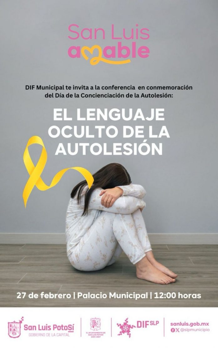 SLP.- El Sistema Municipal DIF de SLP impulsa la prevención de la autoagresión con la conferencia «El lenguaje oculto de la autolesión» que se llevará a cabo el 27 de febrero a las 12:00 horas en el Palacio Municipal, en el marco del Día Mundial de la Concienciación sobre la Autolesión que se conmemora el 1 de marzo.