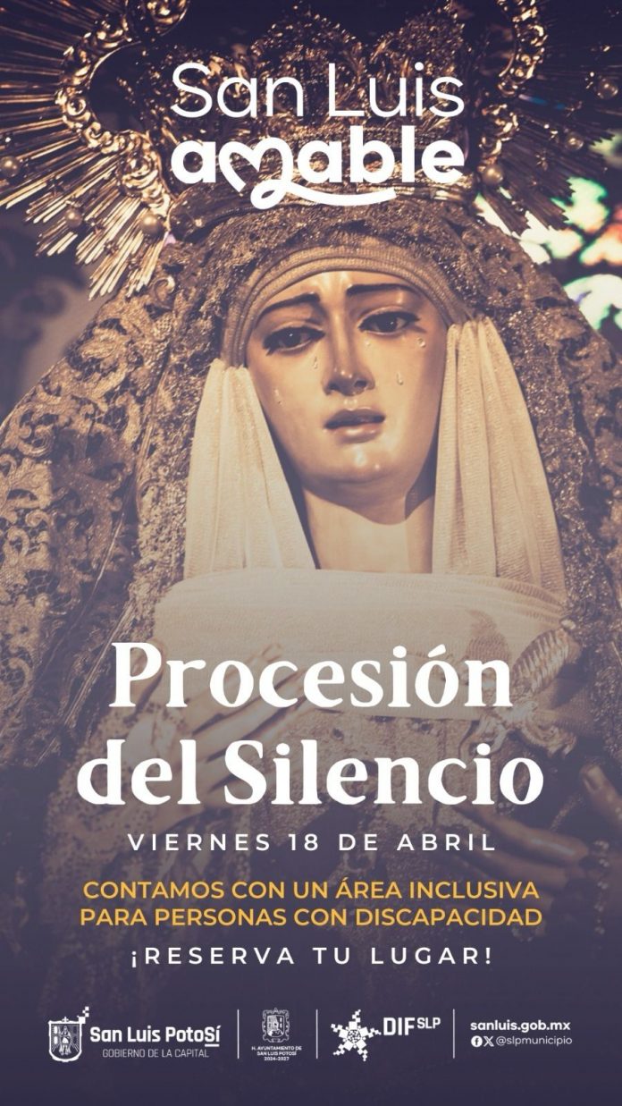 SLP.- En este San Luis Amable, cada paso hacia la inclusión lo damos con firmeza y sensibilidad, por eso, la Presidenta del DIF Municipal Estela Arriaga Márquez, invita a las personas con discapacidad y un acompañante, a vivir la Procesión del Silencio 2025 desde un espacio diseñado especialmente para que vivan esta experiencia de tradición, respeto y profunda emoción.
