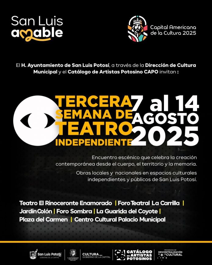 El Ayuntamiento de San Luis Potosí, a través de la Dirección de Cultura Municipal y el Catálogo de Artistas Potosinos (CAPO), anuncia la programación oficial de la Tercera Semana de Teatro Independiente 2025, que se llevará a cabo del 7 al 14 de agosto en diversos espacios de la ciudad.